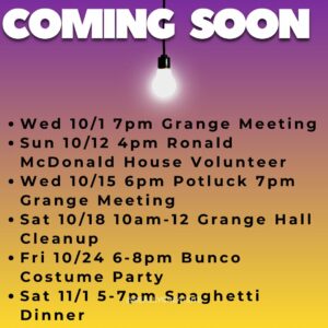 TO SUBMIT A GRANGE EVENT: Email osgevents@orgrange.org with title, time, date, location, contact person info, and indication of this being a Pomona or a Community Grange event and optionally a jpeg flyer (PDF will not work). Please report any non functional emails or phone numbers to this email address