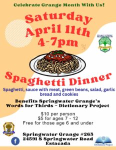 TO SUBMIT A GRANGE EVENT: Email osgevents@orgrange.org with title, time, date, location, contact person info, and indication of this being a Pomona or a Community Grange event and optionally a jpeg flyer (PDF will not work). Please report any non functional emails or phone numbers to this email address